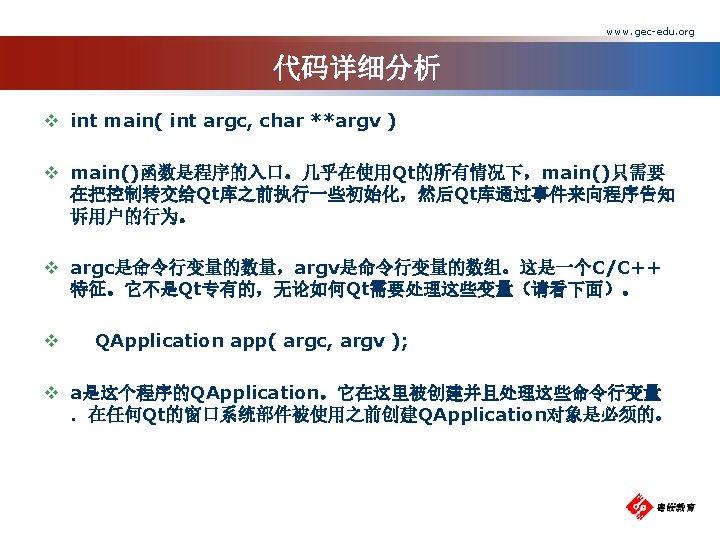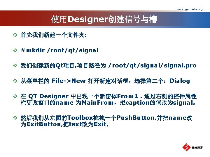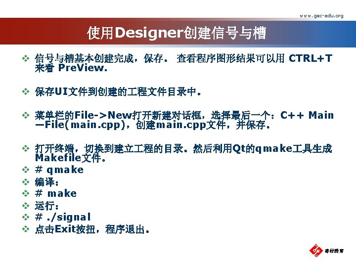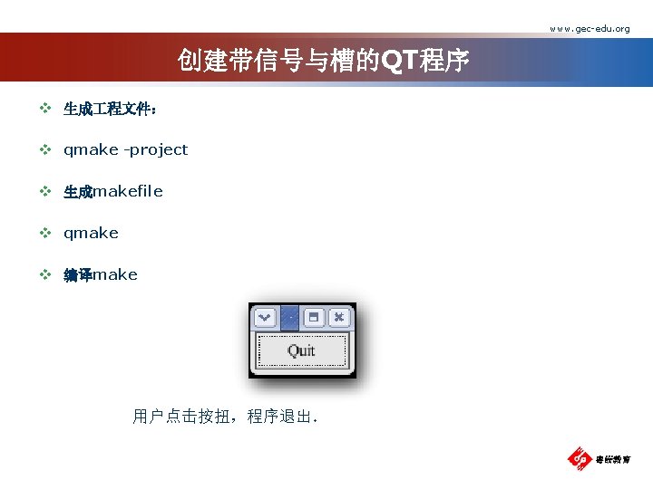 www. gec-edu. org 创建带信号与槽的QT程序 v 打开一个终端,用vi建立一个文件slot. cpp 键入如下程序: v #include <qapplication. h> v #include <qpushbutton. h> v v v int main( int argc, char **argv ) { QApplication a( argc, argv ); //创建QApplication对象 QPush. Button quit( "Quit", 0 ); //添加一个按扭, 因为这个按钮是一个顶层窗口,我们把0作为它的父对象 quit. resize( 75, 30 ); //设置按扭尺寸 QObject: : connect( &quit, SIGNAL(clicked()), &a, SLOT(quit()) ); // quit按扭的clicked信号与QApplication对象的quit()槽连接 a. set. Main. Widget( &quit ); //设置a为这个应用程序的主窗口部件 quit. show(); //显示quti按扭 return a. exec(); }