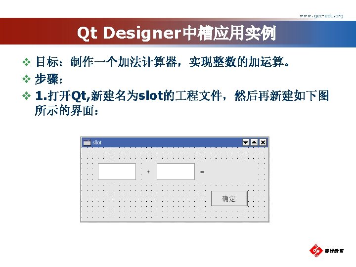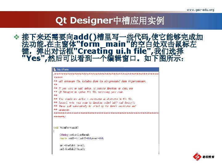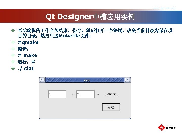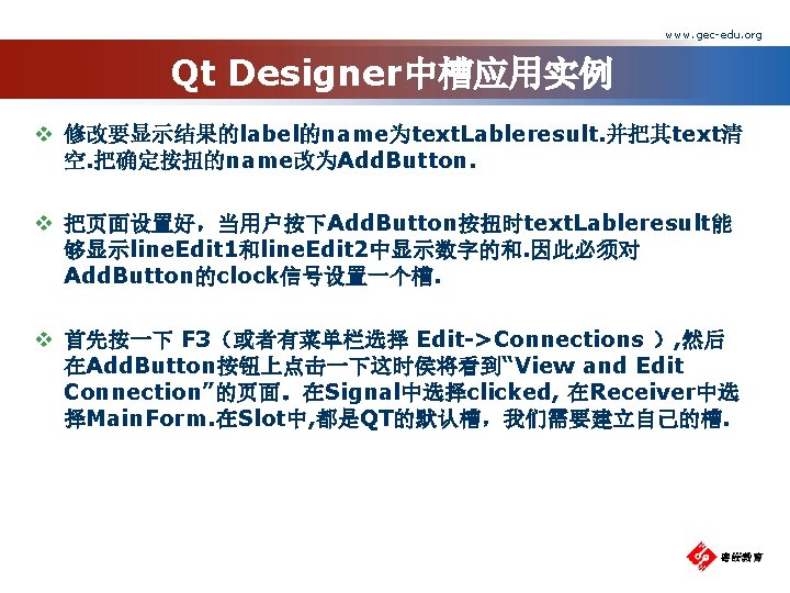 www. gec-edu. org Qt Designer中槽应用实例 void Main. Form: : add() { QString str 1, str 2, str. Result; double add 1=0. 0, add 2=0. 0, result=0. 0; str 1=line. Edit 1 ->text(); str 2=line. Edit 2 ->text(); bool ok 1=FALSE, ok 2=FALSE; add 1=str 1. to. Double(&ok 1); add 2=str 2. to. Double(&ok 2); if(ok 1&&ok 2) { result=add 1+add 2; str. Result. sprintf("%f", result); text. Label. Result->set. Text(str. Result); } }