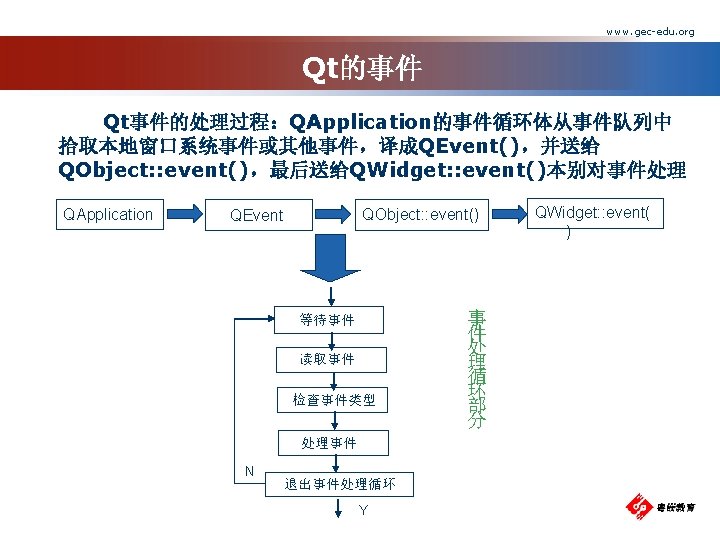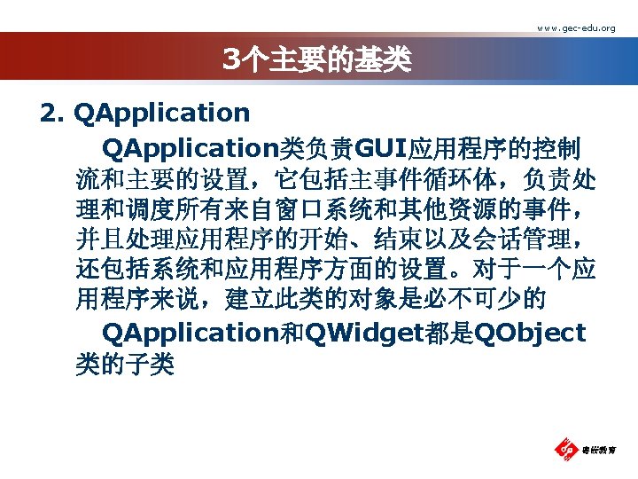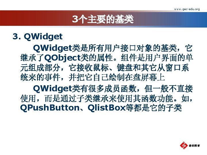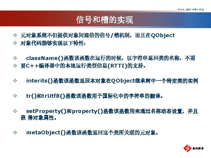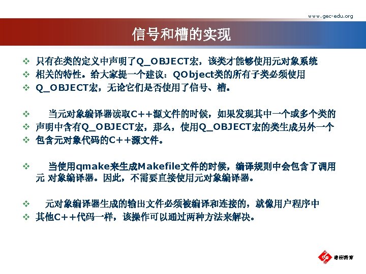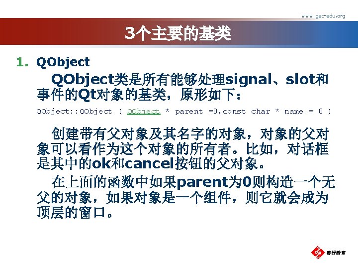 www. gec-edu. org QObject类(一) class Mandelbrot: public QObject { Q_OBJECT //需要使用signal和slot public : Mandelbrot(QObect *parent=0, const char *name); …… public slots: void start(); signals: void done(); private slots: void calculate(); private: QTimer timer; …… };