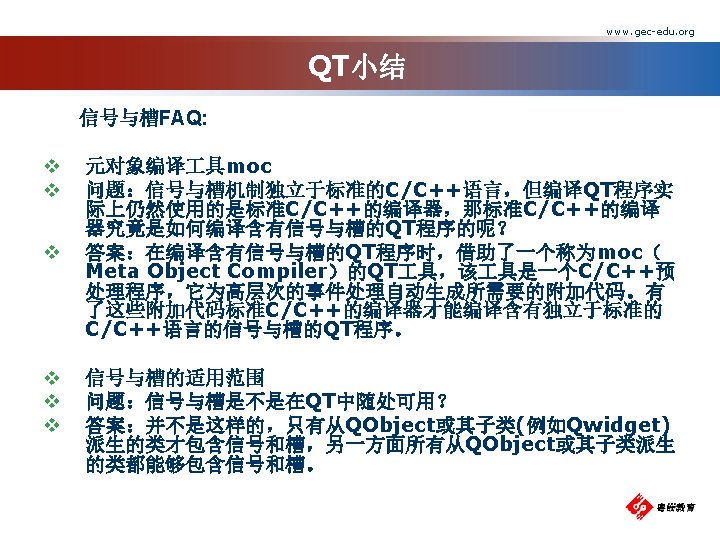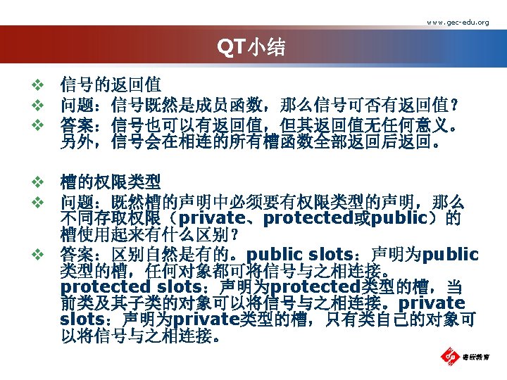 www. gec-edu. org Signal和Slot的连接方式(二) v 同一个信号连接多个插槽 connect(slider, SIGNAL(value. Changed(int)), spin. Box, SLOT(set. Value(int))); connect(slider, SIGNAL(value. Changed(int)), this, SLOT(update. Status. Bar. Indicator(int))); v 多个信号连接到同一个插槽 connect(lcd, SIGNAL(overflow()), this, SLOT(handle. Math. Error())); connect(calculator, SIGNAL(division. By. Zero()), this, SLOT(handle. Math. Error()));