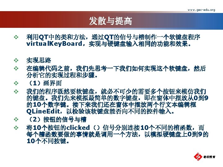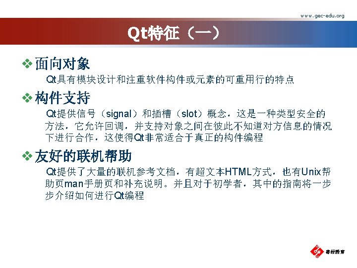 www. gec-edu. org Signal和Slot的连接方式(三) v 一个信号连接到另一个信号 connect(line. Edit, SIGNAL(text. Changed(const QString &)), this, SIGNAL(update. Record(const QString &))); v 取消一个连接 disconnect(lcd, SIGNAL(overflow()), this, SLOT(handle. Math. Error())); v 取消一个连接不是很常用,因为Qt会在一个对象 被删除后自动取消这个对象所包含的所有的连接