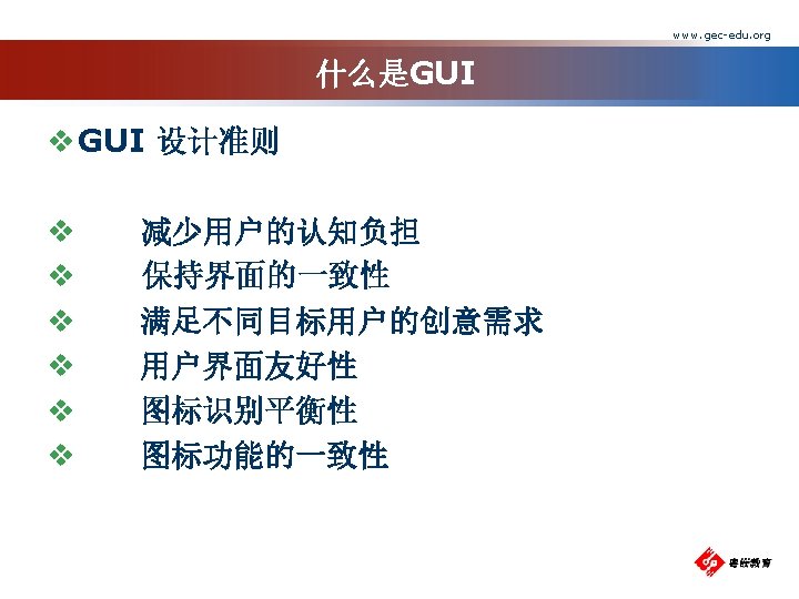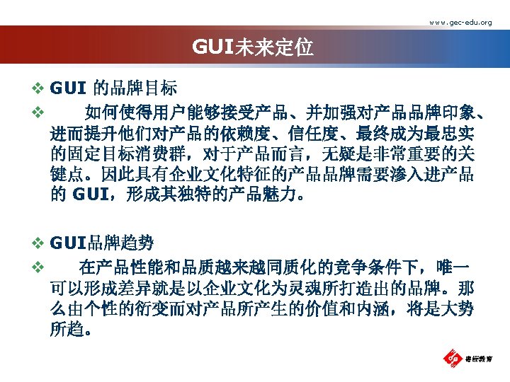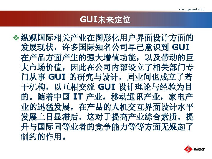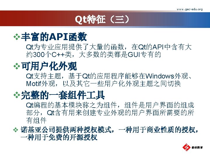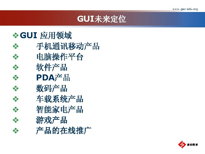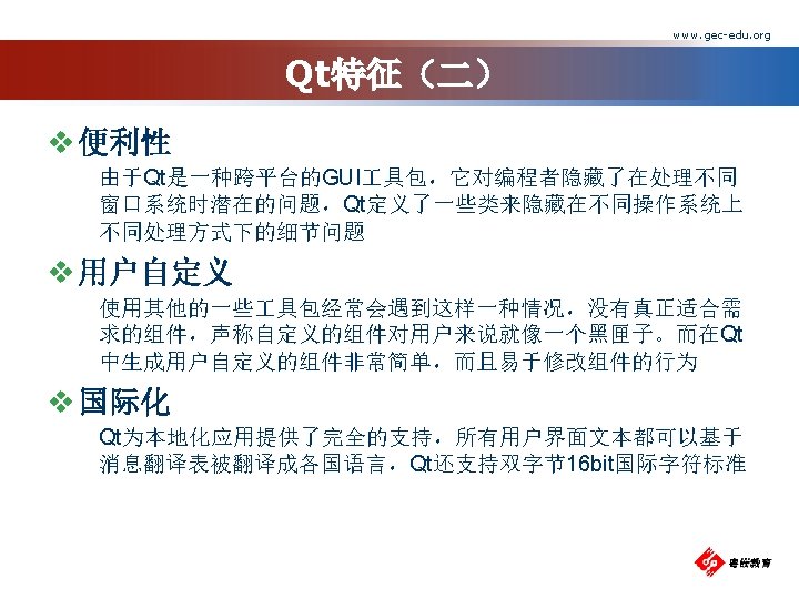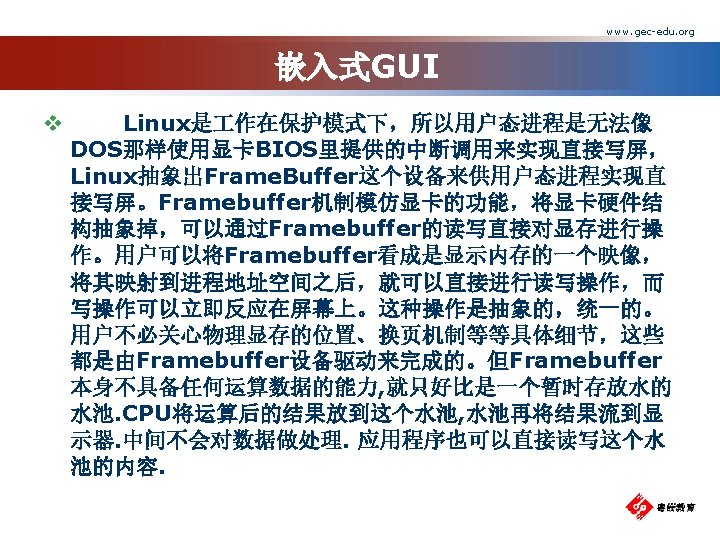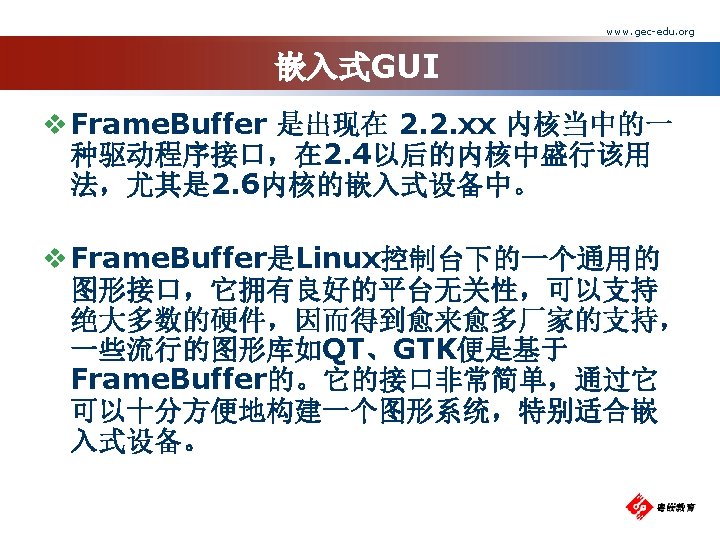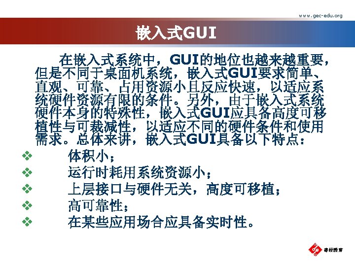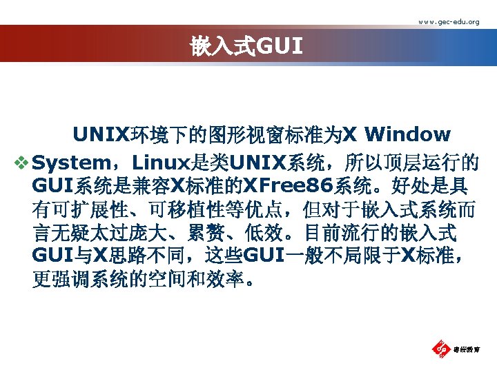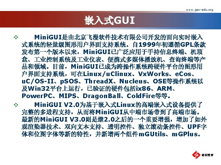 www. gec-edu. org 嵌入式GUI v 目前在嵌入式系统比较流行的图形用户界面GUI : § Qt/Embedded § Micro. Windows § Mini. GUI