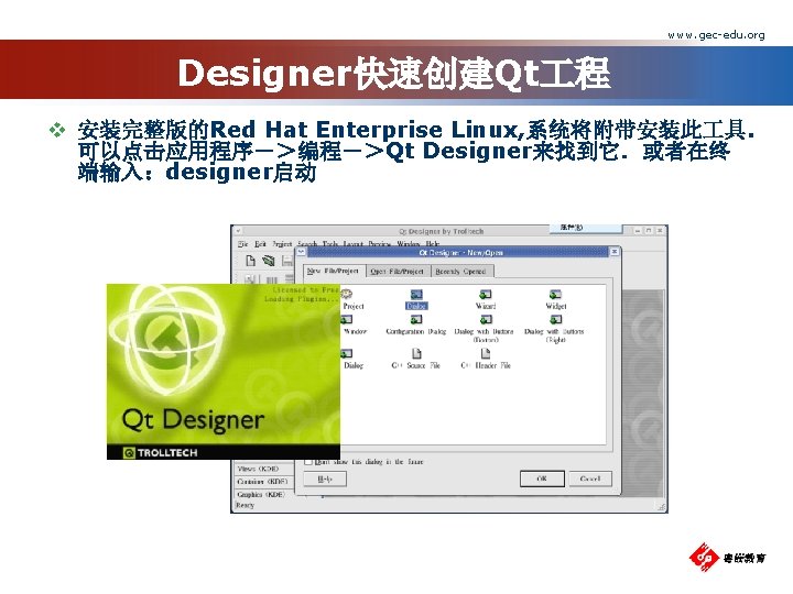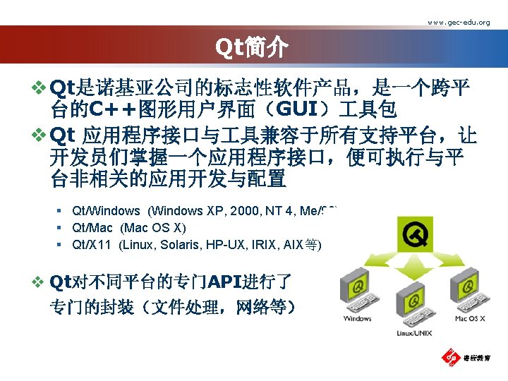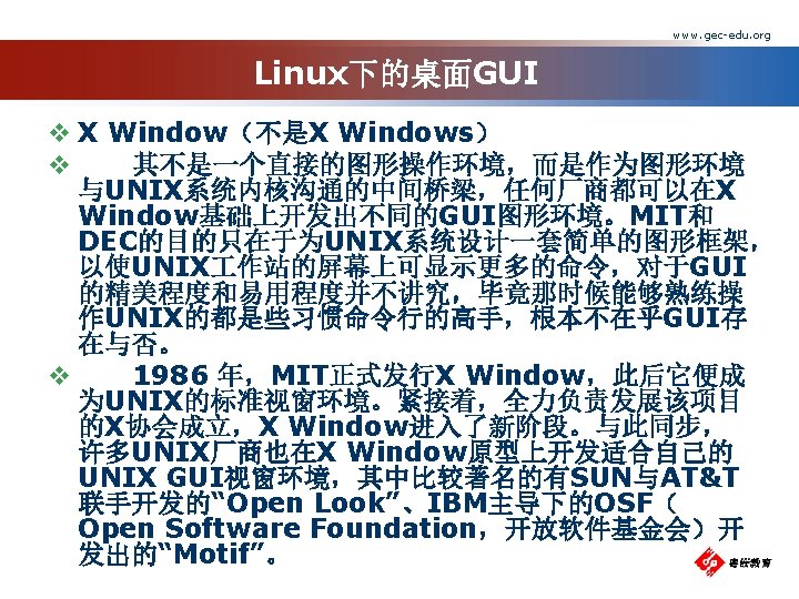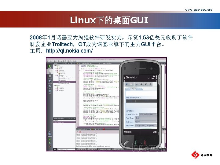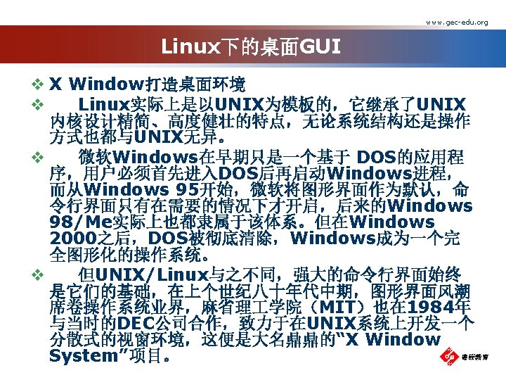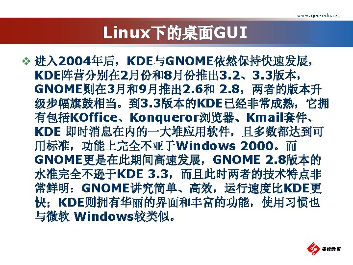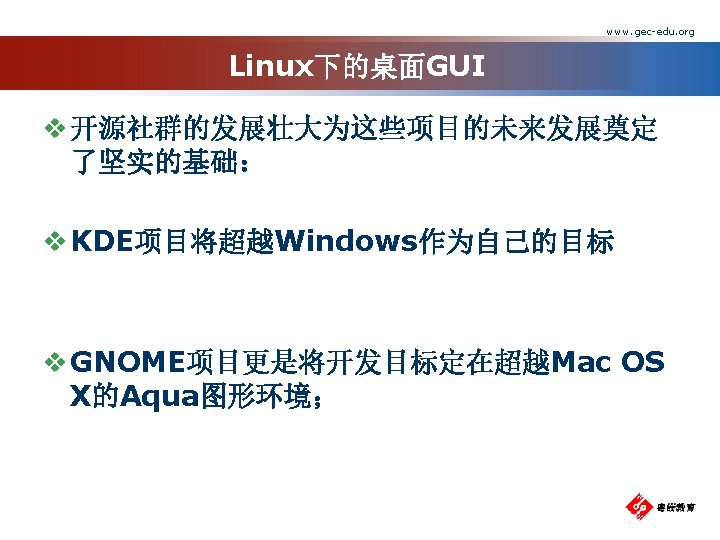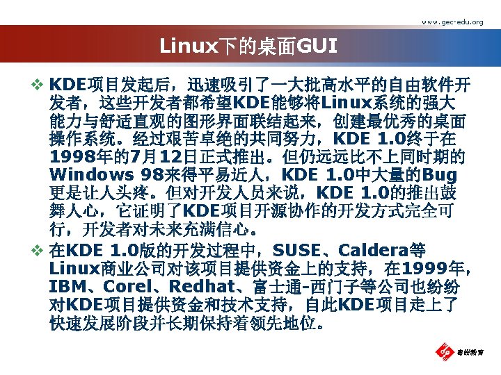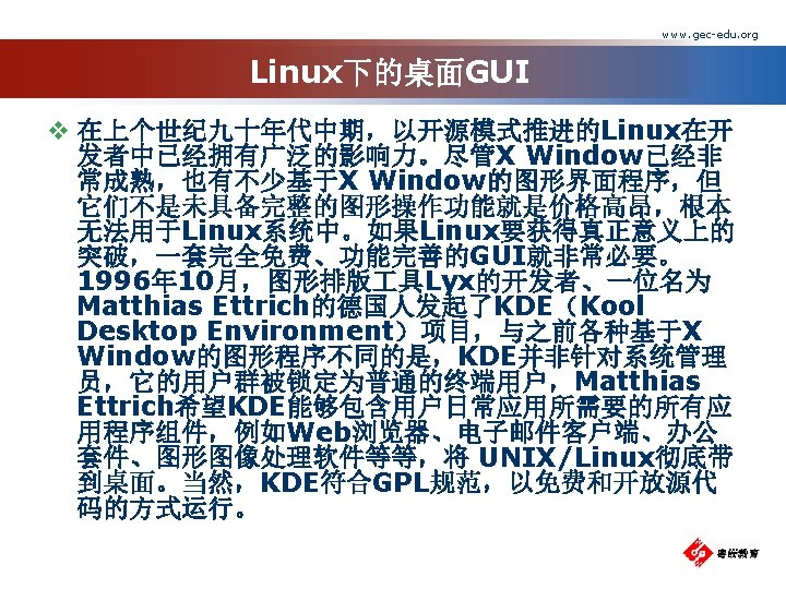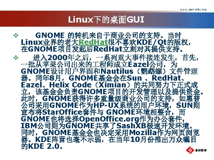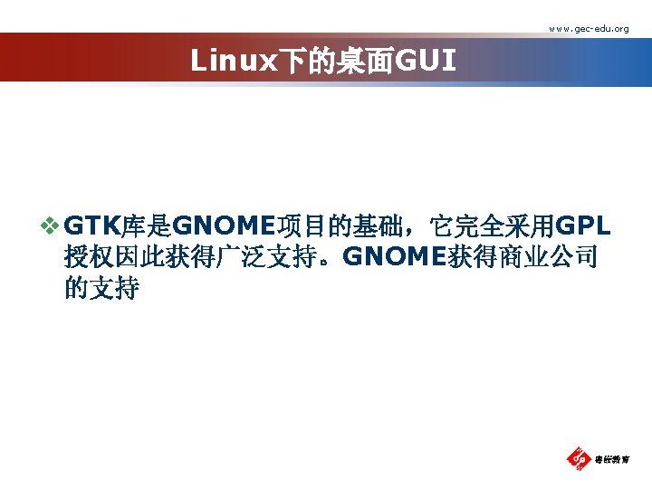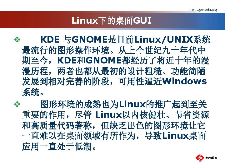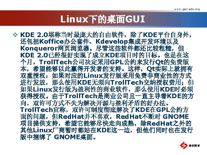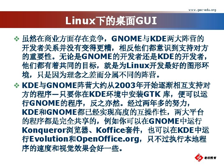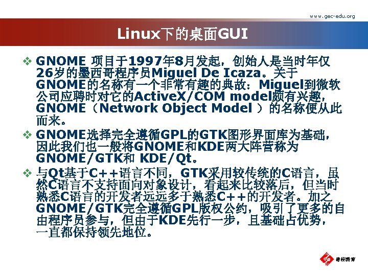 www. gec-edu. org Linux下的桌面GUI v Qt是整个KDE的基础 v GNOME与KDE交替发展