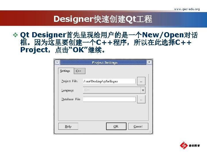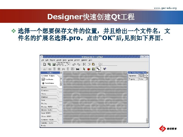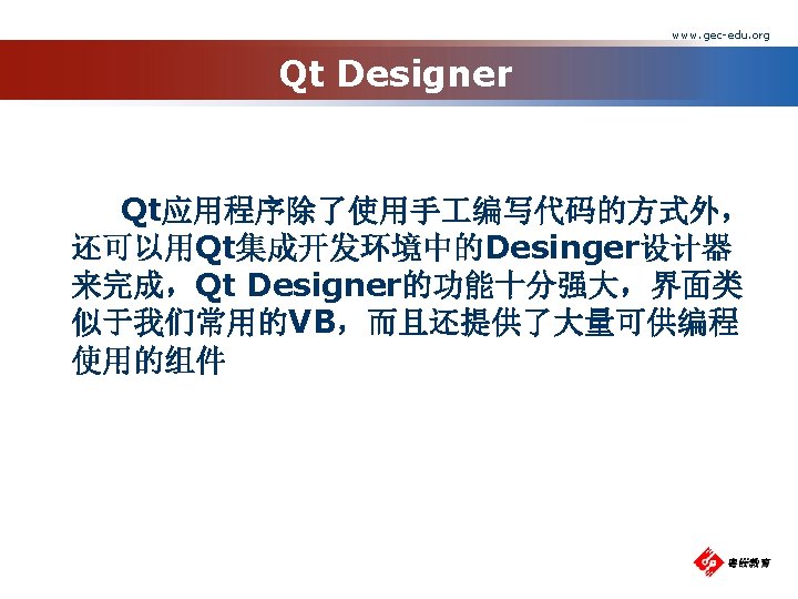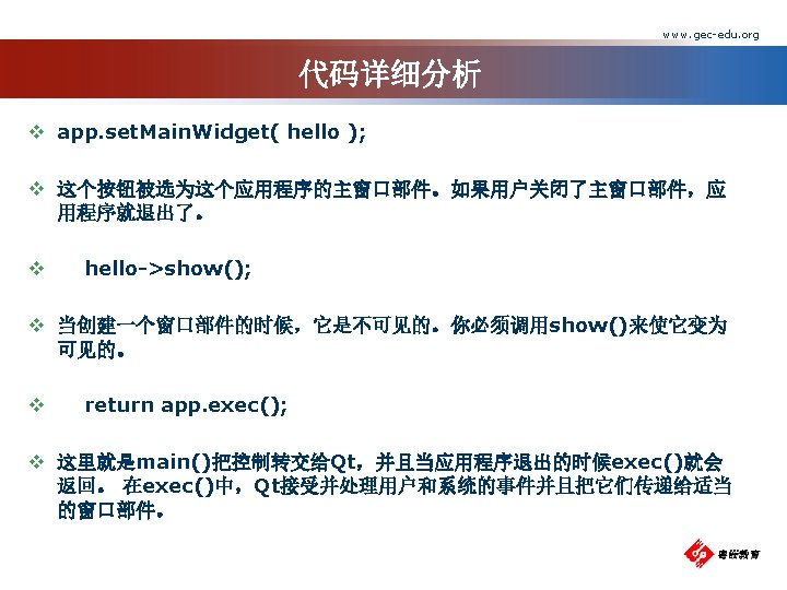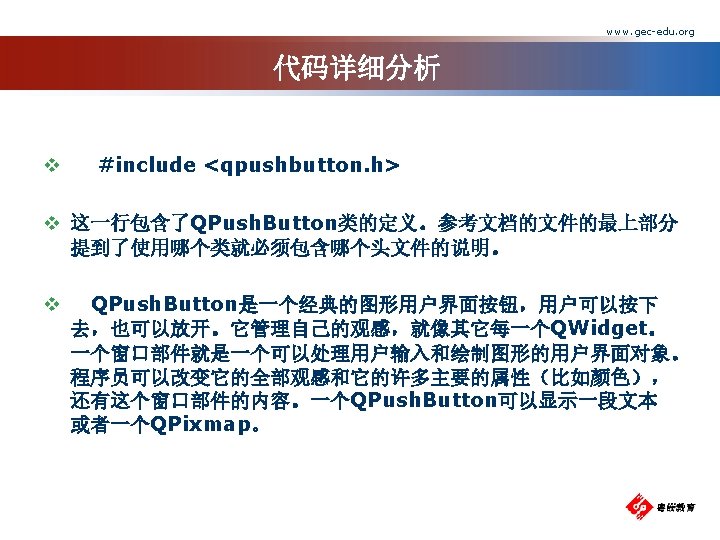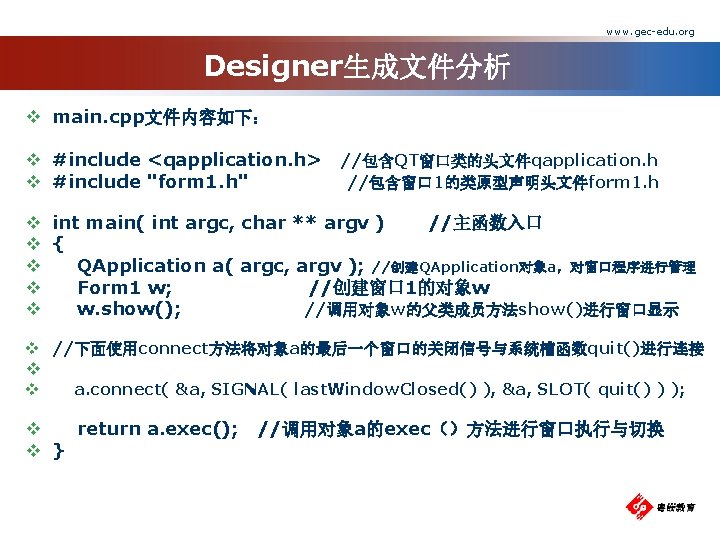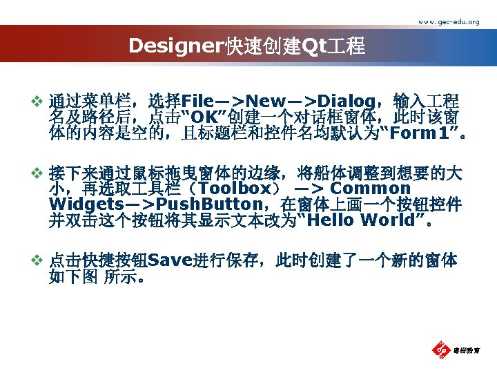 www. gec-edu. org Designer生成文件分析 v v v v v push. Button 1 = new QPush. Button( this, "push. Button 1" ); //实例化一个新的按钮 push. Button 1 ->set. Geometry( QRect( 70, 60, 211, 61 ) ); //设置该按钮的位置属性 language. Change(); //显示控件上的文本信息 resize( QSize(354, 199). expanded. To(minimum. Size. Hint()) ); //设置窗口显示属性,从 QSize(354, 199) 和 minimum. Size. Hint()(返 回一个 QSize对象)中取两者之中的最大宽度和最大高度组成一个新的 QSize 对象。 clear. WState( WState_Polished ); //常见于用 Designer 生成的代码中。由于 WState_Polished 是一个内部标 志,在用户的代码中一般不要使用它。 } Form 1: : ~Form 1() //析构函数 { // no need to delete child widgets, Qt does it all for us } void Form 1: : language. Change() //显示空间文本信息 { set. Caption( tr( "Form 1" ) ); push. Button 1 ->set. Text( tr( "Hello World" ) ); //在按键上显示Hello World }