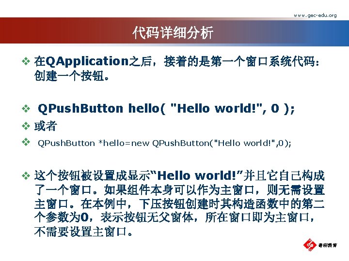 www. gec-edu. org 创建第一个QT程序 v v 打开一个终端,建立一个文件夹,如:mkdir hello 然后进入这个文件夹:cd hello 创建c++文件,vi hello. cpp 在文件中键入下面的代码: v #include <qapplication. h> v #include <qpushbutton. h > v v v v int main(int argc, char *argv[]) { QApplication app(argc, argv); QPush. Button *hello=new QPush. Button("Hello World!", 0); app. set. Main. Widget(hello); hello->show(); return app. exec(); }