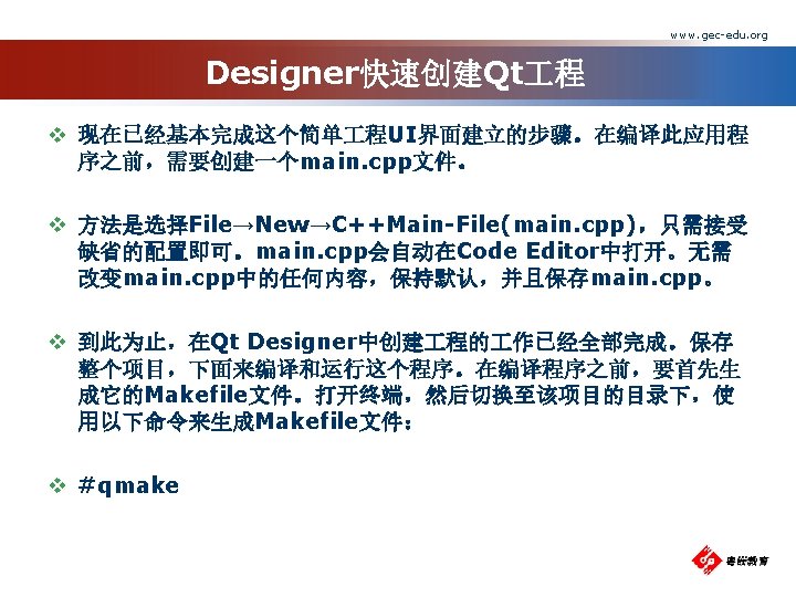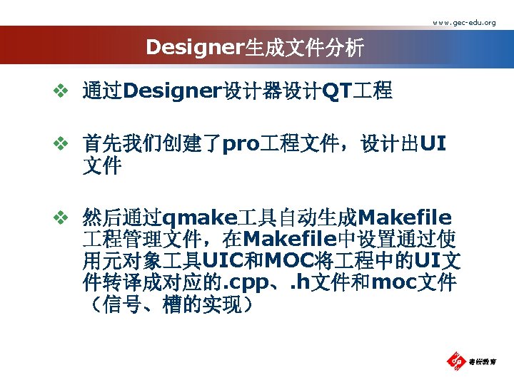www. gec-edu. org Designer生成文件分析 v Hello. pro文件分析 v TEMPLATE = app #QT模板为app v LANGUAGE = C++ # 程文件路径为当前目录 v v v v CONFIG += qt warn_on release #CONFIG的配置模块, 一般采用默认即可 # QT运行系统环境设置 unix { # Unix系统环境则执行以下内容 UI_DIR =. ui # Ui文件的存放目录 MOC_DIR =. moc # Moc文件的存放目录 OBJECTS_DIR =. obj # 程目标. o文件的存放目录 } v SOURCES += main. cpp # 程文件源码包含main. cpp v FORMS = form 1. ui # 程UI文件包含form 1. ui