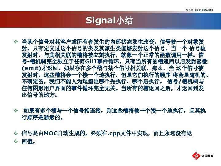 www. gec-edu. org Signal和Slot的声明(二) signal的发出一般在事件的处理函数中,利 用emit发出signal,在下面的例子中在在事件 处理结束后发出signal void Student: : set. Mark(int new. Mark) { if (new. Mark!= my. Mark) { my. Mark = new. Mark; emit mark. Changed(my. Mark); } }