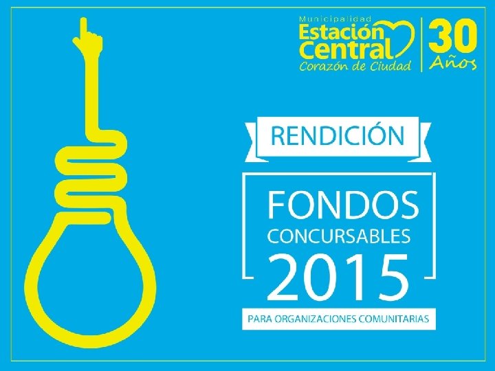 Ejemplo: “Rendición de Fondos Concursables” Municipalidad de Estación Central Estamos Todos Contentos 69, 254, 300 -9 $479. 668 Un computador para Todos! 14/12/2015 100 - 9875 $479. 668 --- Felicia Alegría 5. 858. 697 -2 Juan Cuevas 6. 648. 367 -8