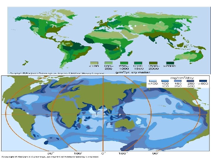 Hábitat Biomasa Kg/ m 2 Tasa de renovación=P/B Bosque tropical Producción primaria neta kg/m 2 año 1, 8 42 0, 043/año Tiempo de residencia= B/P 23, 3 años Terrestres Bosque templado 1, 250 32 0, 037/año 27 años Bosque boreal 0, 8 20 0, 04/año 25 años Arbustal 0, 6 6 0, 1/año 10 años Sabana 0, 7 4 0, 175/año 5, 7 años Pradera templada 0, 5 1, 5 0, 33/año 3 años Tundra y alpino 0, 14 0, 6 0, 23/año 4, 3 años Matorral de desierto Tierra cultivada 0, 07 0, 1/año 10 años 0, 630 1 0, 63/año 1, 6 años 2, 5 15 0, 17/año 5, 9 años Ciénaga y pantano Acuáticos Océano abierto 0, 125 0, 003 41, 7/año 0, 02 años 0, 36 0, 01 36/año 0, 03 años 2 2 1/año 1 año Plataforma continental Lechos de algas y arrecifes Estuarios 1, 8 1 1, 8/año 0, 55 años Lagos y arroyos 0, 5 0, 02 25/año 0, 04 años