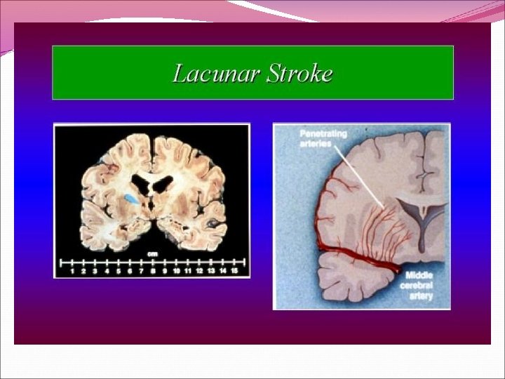 Factores de Riesgo de ACV 2) Hipertensión Arterial: es el factor de riesgo más importante tanto para isquemia como para hemorragia cerebral, encontrándose en casi el 70% de los pacientes con ACV. La HTA agrava la aterosclerosis en el cayado aórtico y arterias cérvico-cerebrales, produce lesiones ateromatosas y facilita las cardiopatías.