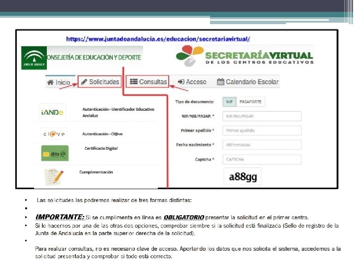 ESPECIAL ATENCIÓN Oferta complementaria y parcial • La solicitud debe ser única (ya sea oferta completa de grado medio o de grado superior u oferta parcial diferenciada), por periodo de admisión. • La presentación de una solicitud en el periodo de septiembre invalidará a la presentada en el periodo de junio, este o no admitida. Para que la nueva solicitud de septiembre se estime, hay que anular matricula (si tuviera) y renunciar a la solicitud de junio. • La Dirección del centro publicará la asignación de plazas a las personas solicitantes en el tablón de anuncios (adjudicación definitiva). • El alumnado admitido que no realice ni matriculación ni reserva en CADA ADJUDICACIÓN, quedará excluido del proceso.