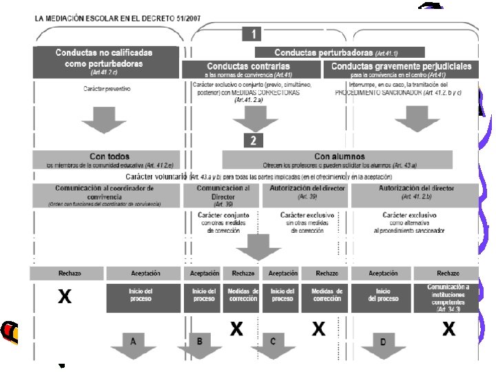 Limitaciones de la mediación • No se llevarán a cabo en el caso de conductas gravemente perjudiciales para la convivencia en las que concurran alguna de las circunstancias agravantes de la responsabilidad que se mencionan en el artículo 32. 2 del Decreto 51/2007 • En conflictos entre alumnos. . . • . . . motivados por conductas gravemente perjudiciales para la convivencia en el centro en las que concurran circunstancias agravantes de: • a) Premeditación. • b) Reiteración. • c) Incitación o estímulo a la actuación individual o colectiva lesiva de los derechos de los demás miembros de la comunidad educativa. • d) Situaciones de alarma social causada por las conductas, con especial atención a aquellos actos que presenten características de acoso o intimidación a otro alumno. • e) Especial gravedad en los perjuicios causados al centro o a cualquiera de los integrantes de la comunidad educativa. • f) Publicidad o jactancia de conductas perturbadoras de la convivencia a través de aparatos electrónicos u otros medios.