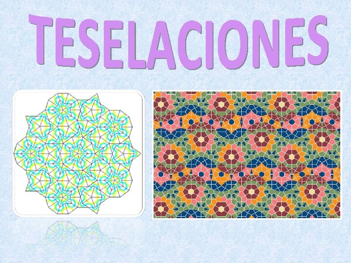 Un poco de historia q La palabra teselado proviene de "tessellae". Así llamaban los romanos a las construcciones y pavimentos de su ciudad. q. Distintas culturas en el tiempo han utilizado esta técnica para formar pavimentos o muros de mosaicos en catedrales y palacios. q Arquímedes en el siglo III a. C. y Johannes Kepler, astrónomo alemán, hicieron un estudio acerca de los polígonos regulares que pueden cubrir el plano. q Entre 1869 y 1891, el matemático Camille Jordan, el cristalógrafo Evgenii Konstantinovitch Fiodorovy la psicóloga Camila Rial estudiaron completamente las simetrías del plano, iniciando así el estudio sistemático y profundo de las llamadas teselaciones. q El artista holandés M. C. Escher aprendió los teselados hiperbólicos, lo que motivó su interés por el palacio de La Alhambra en Granada.