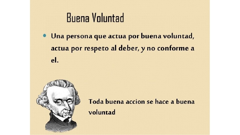 PRINCIPIOS DE LA ÉTICA KANTIANA • Voluntad: es buena en si misma • Sigue el mandato del deber: “la necesidad de una acción por respeto a la ley” • Lo que hace moral a una conducta es cuando es realizada o guiada por la buena voluntad • La utilidad, la eficiencia para conseguir un fin, son tan solo accesorios, que no le restan ni le dan valor. • La voluntad es buena cuando se obra impulsado por el deber.