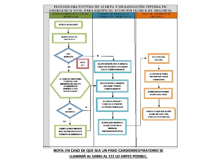 ¿QUÉ HACE SI SE ENCUENTRA A UN PCTE TENDIDO EN EL PISO INCONSCIENTE? 1 Primer miembro del personal, éste solicitará a viva voz que se active el timbre de emergencia, permaneciendo en el lugar acompañando al usuario afectado esperando la concurrencia del equipo de emergencia. 2 El primer personal constituido en el lugar iniciará de inmediato la valoración y los cuidados de apoyo vital que el caso amerite: Valoración: estado de conciencia, pulso, vía aérea. Cuidados de apoyo vital, RCP Básica si es necesario. 3 El sistema de activación de alerta del CESFAM Rodelillo corresponde a un timbre el que debe activarse de manera continua durante 30 segundos y se encuentra ubicado en los siguientes lugares: Zona 1: Oficina número 3 (preparación del sector A) Zona 2: Oficina número 26 (preparación de sector B) 4 La persona que active el timbre de emergencia se quedará al lado de este timbre hasta que llegue el equipo clínico para informarles dónde está ocurriendo la emergencia. 5 Ante la señal de TIMBRE, el equipo clínico de urgencia constituido por MEDICO ENFERMERA y PARAMEDICOS, concurren de manera inmediata al sector donde tiene lugar la emergencia. 6 El equipamiento e insumos requeridos para prestar la atención de estos casos –por ejemplo, botiquín de emergencia deberán estar disponibles en ese momento en el sector del evento. 7 Ante cualquier falla del sistema de llamada por TIMBRE, el aviso se realizará directamente a los profesionales implicados a viva voz y/o procediendo a ir a buscarlo a su oficina diciendo “URGENCIA” 8 Todo paciente que presenta un Paro Cardiorrespiratorio será trasladado al servicio de emergencia por el mecanismo más expedito (131 SAMU) EQUIPO CLÍNICO DE URGENCIA ZONA 1 TITULAR ZONA 1 REEMPLAZO Medico Alfonso Castro. Lenina Espíndola/Carlos Espinoza/Iván Carrasco. Enfermero/a Paramédico Adrián Cataldo Paola Trujillo Nelly Cruz Gloria Manríquez Luisa Alam Marina Herrera Mackarena Tapia Pamela Uribe Natalia Colarte Ingrid Benni EQUIPO CLÍNICO DE URGENCIA ZONA 2 Medico Alfonso Castro Enfermero/a Mackarena Tapia Eduardo Ramírez Paramédico Natalia Colarte Maritza Quiroz Pamela Uribe EQUIPO CLÍNICO DE URGENCIA CONTINUIDAD DE LA ATENCIÓN Medico Profesional TENS AUXILIAR DENTAL Administrativo de urgencia Guardia TITULAR ZONA 2 REEMPLAZO Lenina Espíndola/Carlos Espinoza/Iván Carrasco/Nicolás Johnson Paola Trujillo/Marina Herrera Adrián Cataldo/María Paulina Muñoz Luisa Alam Nelly Cruz Gloria Manríquez TITULAR CONTINUIDAD DE LA ATENCIÓN REEMPLAZO Odontologo Medico de turno Odontólogo u otro profesional de turno Paramédico de turno Auxiliar dental de turno Administrativo de turno Guardia de turno