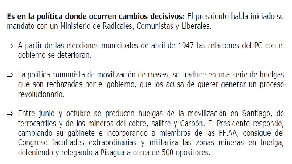 Los Gobiernos radicales 1938 -1952 • Llegan al poder gracias al Frente Popular pero se separan en 1941. • Desde entonces y por los próximos 14 años, el Partido Radical se transformó en la principal fuerza política del país, expresado en las presidencias de: Pedro Aguirre Cerda (1938 -1941), Juan Antonio Ríos (1942 -1946) y Gabriel González Videla (1946 -1952). • Son los primeros gobiernos que representan los intereses de los sectores populares. • Durante este periodo aumenta la clase media, la prestación de servicios sociales (educación, salud, vivienda, previsión social, etc). Surge la Tecnocracia, especialistas técnicos o profesionales que integraran el Estado.