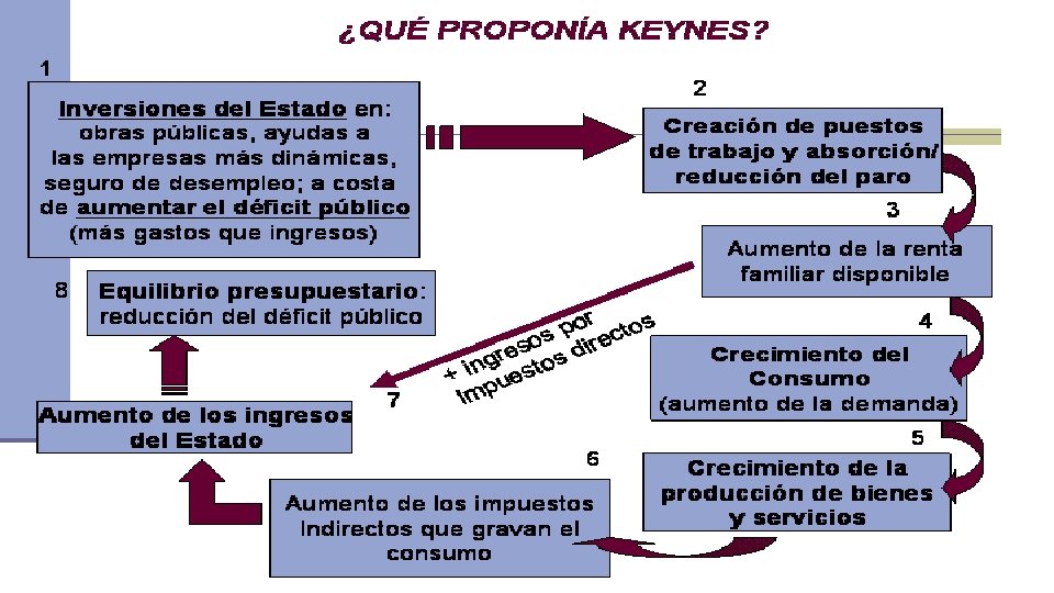 ¿Qué proponía Keynes? • Básicamente que el Estado tuviera un rol más activo en la economía para evitar los efectos sociales y políticos de las crisis económicas. • El Estado debía ser el principal empresario, promover los procesos de industrialización y fomentar la iniciativa privada a través de subsidios estatales.