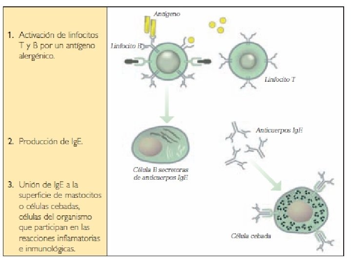 Fases Primera fase: Sensibilización 1. -Exposición al alérgeno. 2. -Reacción del cuerpo produciendo anticuerpos Ig. E ¿Cómo? Los linfocitos TCD 4 y el linfocito B captan al alérgeno. Los T se transforman en célula plasmática y secretan anticuerpos o Ig. E. Los Ig. E se unen a receptores ubicados en las paredes del mastocitos o células cebadas. En esta fase no se experimentan síntomas. Pero la persona se ha sensibilizado.