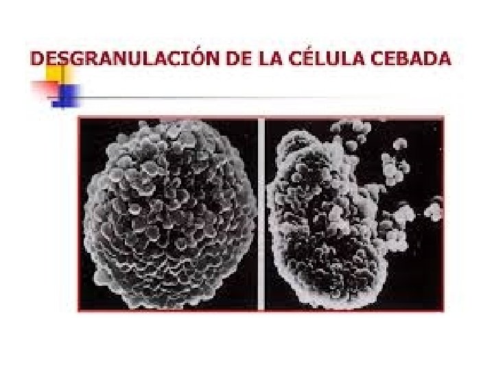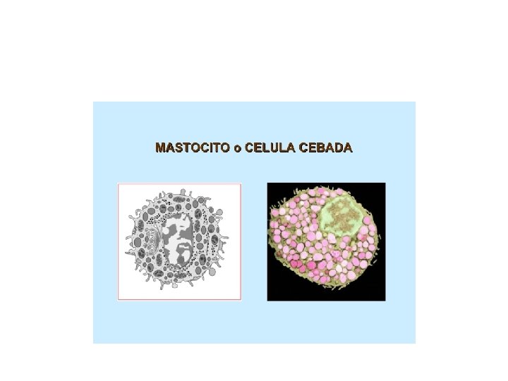 Mastocitos o células cebadas • Células presentes en piel y órganos como nariz, ojos y boca sistema respiratorio, digestivo, cargadas de gránulos de histamina.