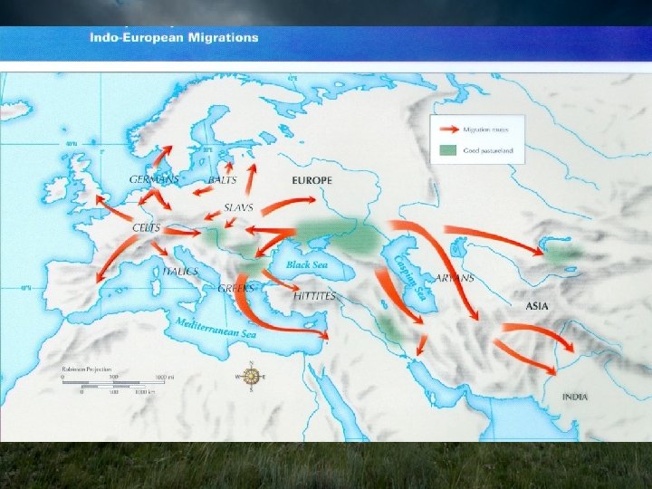 Indo-Europeans • Indo-Europeans were a group of nomadic and pastoral peoples • They originally came from the Steppe— dry grassland regions, around modern Southwestern Russia • They domesticated the horse and invented the wheeled chariot. • They migrated from their homeland on the Steppe, possible because of – Overpopulation – Famine (no food) – Escape from Invaders