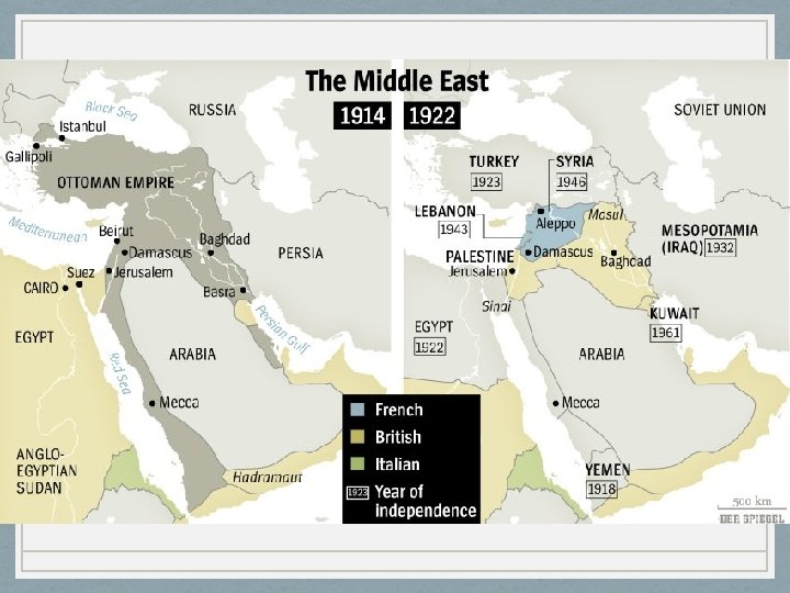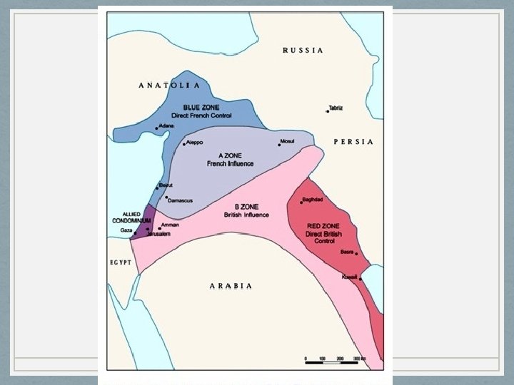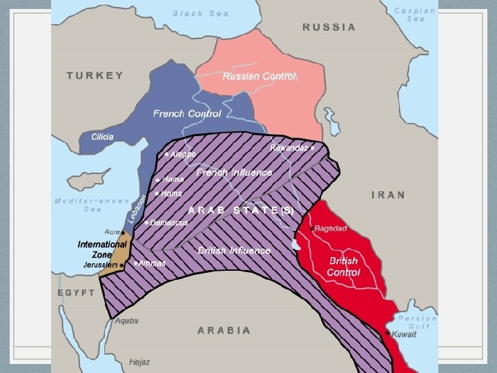 • Russians want Constantinople and the Dardanelles • French want the Mediterranean Coast (Levant) • British want area near Egypt to protect their Suez Canal and Southern Mesopotamia for the oil