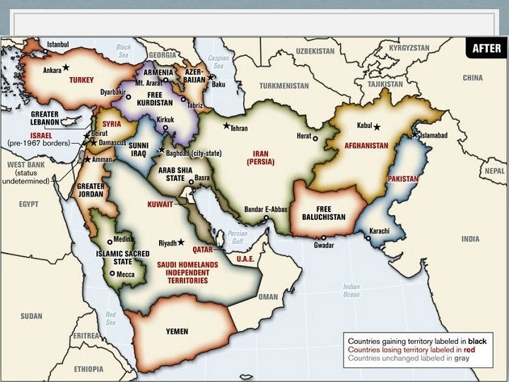 Modern Conflicts The following map is a 2006 proposed plan to redrawn the borders of the Middle East by Ralph Peters, a retired United States Army lieutenant colonel, author, and Fox News commentator. It was original published in the Armed Forces journal in an article titled Blood borders: How a better Middle East would look. Would this be better? Should Western nations try to intervene and convince/force the Middle East into this new arrangement?