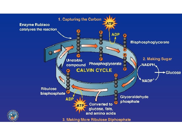 The Specifics of the Calvin Cycle. • The Calvin cycle starts and ends with Ru. BP, which is a five carbon sugar. • Ru. BP stands for ribulose biphosphate. • Carbon dioxide reacts with Ru. BP, creating two molecules of PGA (phosphoglyceric acid). – This is the carbon fixation step.