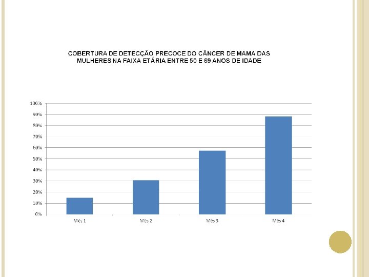 Meta: câncer de Mama: Ampliar a cobertura de detecção precoce do câncer de mama das mulheres na faixa etária entre 50 e 69 anos de idade para 80%. Indicador: CA de Mama: Número de mulheres entre 50 e 69 anos residentes na área e acompanhadas no UBS para prevenção do câncer de mama / número total de mulheres entre 50 e 69 anos residentes na área.