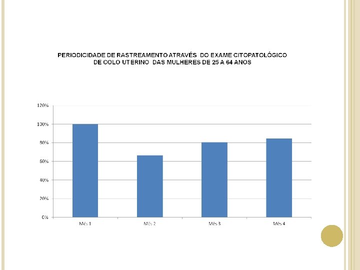 Indicador: número de mulheres residentes na área entre 25 e 64 anos que realizaram o CP com amostra satisfatória / número total de mulheres cadastradas no programa que realizaram o CP. PROPORÇÃO DE MULHERES COM RESULTADOS DE CP COM AMOSTRAS SATISFATÓRIAS 99. 0% 98. 5% 98. 0% 97. 5% 97. 0% 96. 5% 96. 0% 95. 5% 95. 0% 94. 5% Mês 1 Mês 2 Mês 3 Mês 4