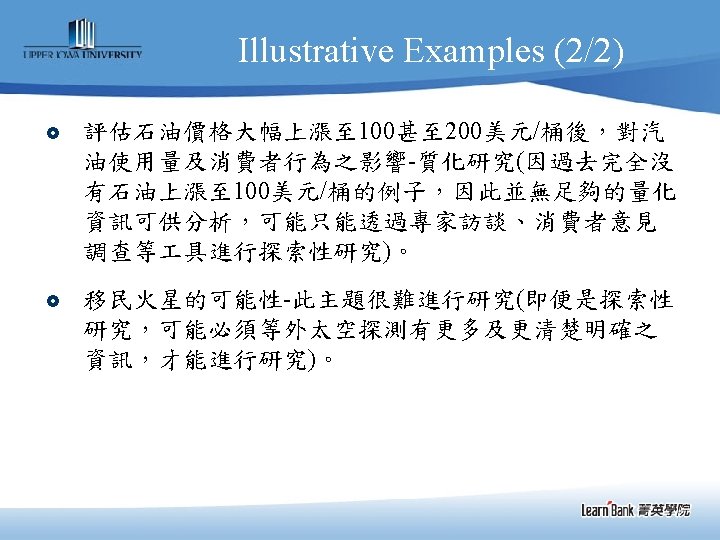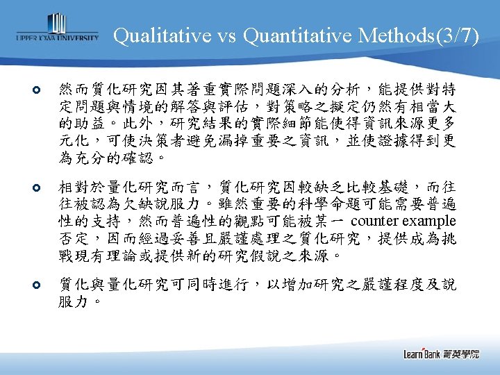 Qualitative vs Quantitative Methods(1/7) £ Managers do business research to understand how and why things happen. £ If the manager needs to know only what happened, or how often things happened, quantitative research methods (量化研究) serve the purposes. £ On the other hand, if he/she plans to understand the different meanings that people place on their experiences often requires research techniques that delve more deeply into people’s hidden interpretation, understandings, and motivations. Under this kind of circumstances, qualitative research methods (質化研究) is the preferred choice.