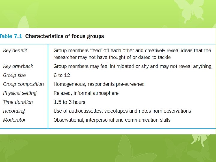 4 Security. Because the respondents’ feelings may be similar to those of other group members, they feel comfortable and are therefore willing to ‘open up’ and reveal thoughts where they may have been reluctant if they were on their own. 5 Spontaneity(doğallık). Because respondents are not required to answer specific questions, their responses can be spontaneous and unconventional and should therefore provide an accurate idea of their views. 6 Serendipity(tesadüfilik). Ideas are more likely to arise unexpectedly in a group than individual interview. There may be issues that the moderator had not thought of. The dynamics of the group can allow these issues to develop and be discussed. Group members, to great effect, may clearly and forcibly ask questions that the moderator may be reluctant to ask.