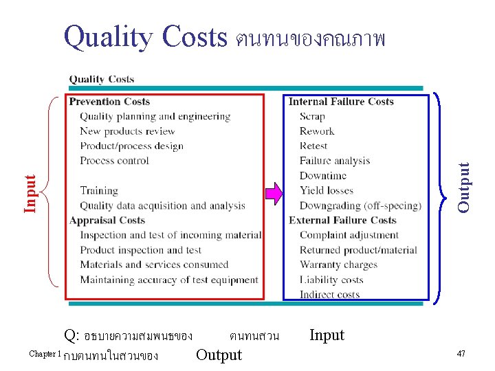 Costs of Quality (continued) • Internal Failure Costs – Costs incurred to fix problems that are detected before the product/service is delivered to the customer. • External Failure Costs – Chapter 1 All costs incurred to fix problems that are detected after the product/service is delivered to the customer. 45