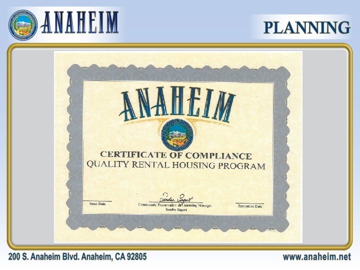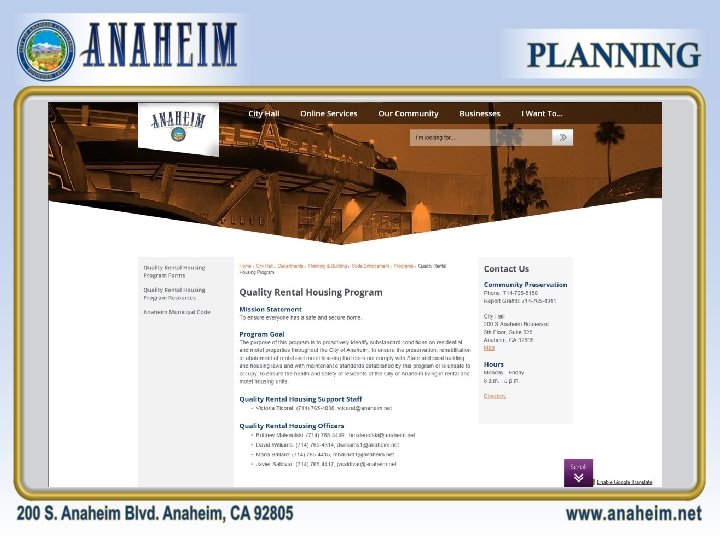MISSION AND GOAL Mission Statement • To ensure everyone has decent, safe and sanitary housing. Goals and Objectives • Proactively identify substandard housing conditions. • Ensure the rehabilitation and/or abatement of substandard housing violations. • Ensure the health and safety of residents of the City of Anaheim living in rental housing units and motels.