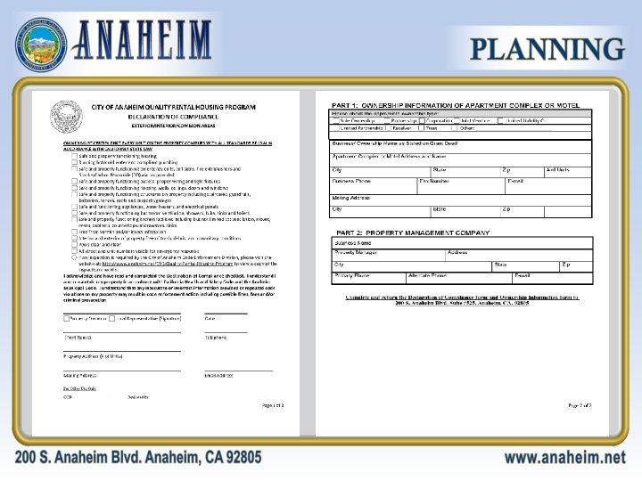• • • BACKGROUND Councilmembers ride-a-long in 2012 Program adopted March 4, 2014 Implemented July 1, 2014 Self Certification component Systematic approach (West to East) Exemptions for apartments & motels 20 years or newer structures Fines for violators Appeals Committee/Process (Reps. from Apartment Assoc. ) Amendment adopted March 21, 2017 to include Motels Exemptions for motels less than 10% of long term stays Appeals Committee/Process (Added Reps. from Hotel/Motel Assoc. )