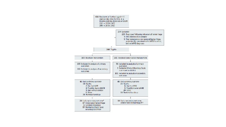 Review Jama 2014 • • • Etude prospective 204 adolescents de 16 ans Suivi sur 12 ans Comparaison traitement médical vs interventionnel Critère de jugement composite : 1. Survenue d’un handicap OHS 2 -5 (déficit mais non dépendant) 2. Survenue d’une complication neurologique (AVC)