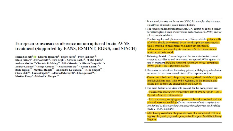 • Comparaison intervention et résultats obtenus dans ARUBA / cohorte prospective • Même critères de jugement (décès et déficit neurologique) • 61/74 patients ont eu intervention • 70, 5% : chirurgie +/- embolisation préalable • Résultats: • Risque élevé AVC ou décès bras traitement : 14, 8% vs 25% ARUBA • 13, 8% patients traités m. RS > 2 • Disparité des résultats ARUBA avec moins de risque hémorragique après traitement