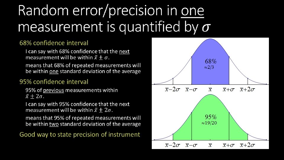Uncertainty due to measurement error A personal error is a mistake. No need to quantify, but we should be able to recognize mistaken data Two other measurement errors which are not accidental Random error Causes repeated measurements to be different Causes wide “margin of error” Systematic error Repeated measurements are consistent All measurements are shifted in a predictable way Can be recognized and corrected by “shifting back”