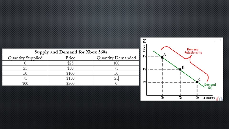 • A CHANGE IN QUANTITY DEMANDED IS CAUSED BY A CHANGE IN THE PRICE OF A GOOD/SERVICE AND IS ILLUSTRATED ON A GRAPH AS A MOVEMENT ALONG THE DEMAND CURVE. • DEMAND IS A RELATIONSHIP THAT SHOWS THE QUANTITY DEMANDED AT EACH PRICE.