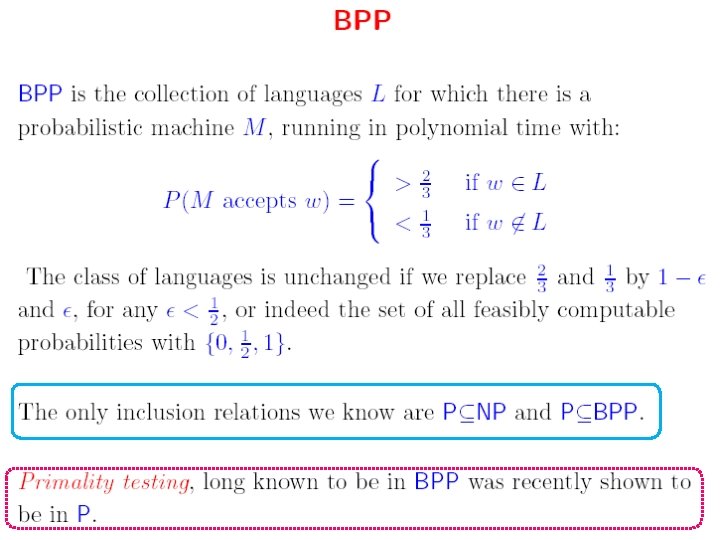 Bounded-error probabilistic polynomial (BPP) • In computational complexity theory, bounded-error probabilistic polynomial time (BPP) is the class of decision problems that are: 1. solvable by a probabilistic Turing machine 2. in polynomial time, 3. with an error probability of at most 1/3 for all instances.