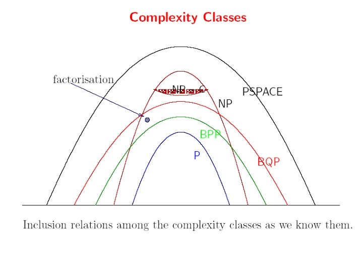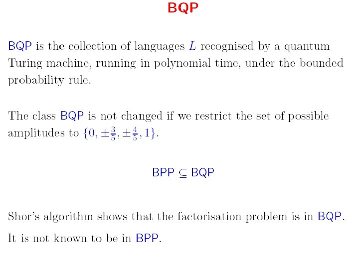 BQP (cont) 1. Similarly to other "bounded error" probabilistic classes the choice of 1/3 in the definition is arbitrary. 2. We can run the algorithm a constant number of times and take a majority vote to achieve any desired probability of correctness less than 1, using the Chernoff bound. 3. Detailed analysis shows that the complexity class is – unchanged by allowing error as high as 1/2 − n−c on the one hand, – or requiring error as small as 2−nc on the other hand, • where c is any positive constant, • and n is the length of input.