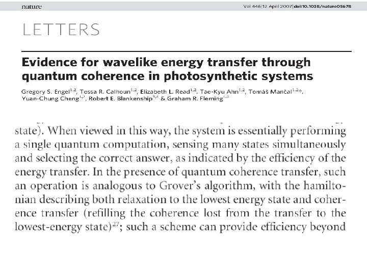 What have we learned? • Complete characterisation of system-environment interaction for biomolecular chromophores. • These spectral densities can be used to make definitive statements about the importance of quantum effects in biomolecular processes. • Due to their tuneable coupling to their environment biomolecular systems may be model systems to use to test ideas in quantum measurement theory. • For chromophores the timescale of the ``collapse’’ is less than 100 fsec.