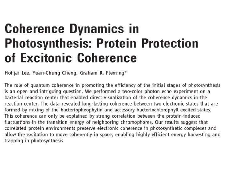Conclusions • Biochemistry happens in a hot wet environment • Spectral density characterises quantum system-environment (protein+ water) interaction for biomolecular chromophores. • These spectral densities can be used to assess claims about the role of quantum effects in biomolecular processes. J. Gilmore and RHM, J. Phys. Chem. A 112, 2162 (2008) condensedconcepts. blogspot. com