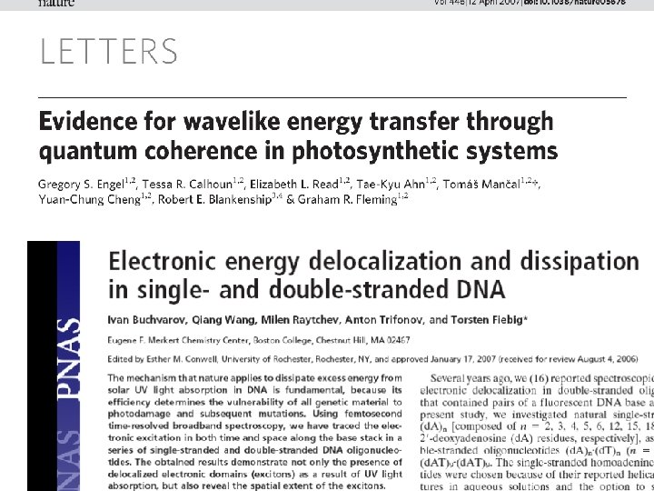 ``Collapse’’ of the wave function • Zurek (`82), Joos and Zeh (`85), Unruh (`89) • Environment causes decay of the off-diagonal density matrix elements (decoherence) • ``Collapse’’ occurs due to continuous ``measurement’’ of the state of the system by the environment. • What is the relevant time scale for these biomolecules? h/(k. BT α) ~ 10 fsec