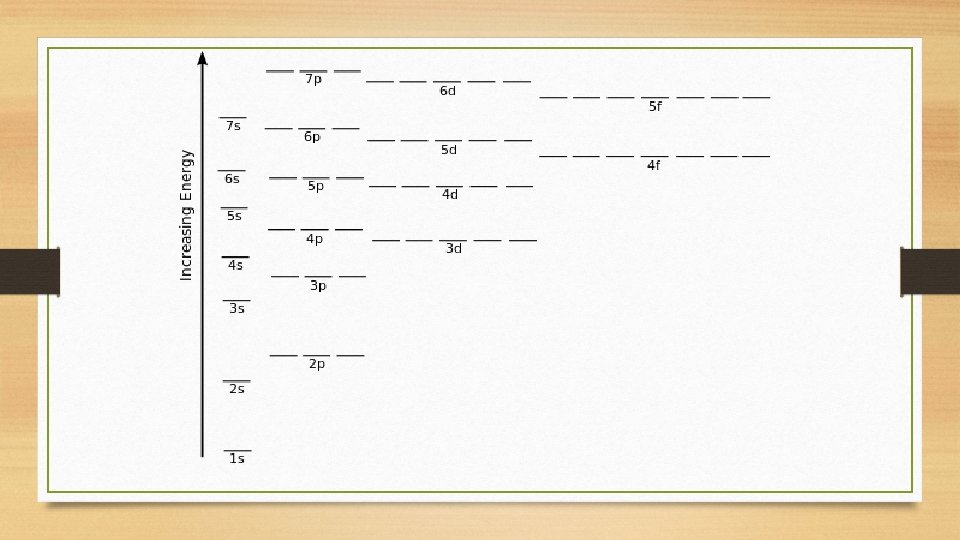Aufbau Principle • Each electron occupies the lowest energy orbital available. • All of one type of orbital on a certain energy level are the same energy (DEGENERATE) • Due to penetration effect, s orbitals are lower in energy than p orbitals • Electrons in an s orbital spend more time closer to the nucleus, so s orbitals have less energy • d orbitals are higher in energy than the s orbital ONE energy level below • f orbitals are higher in energy than the s orbital TWO energy levels below