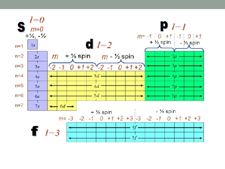 Adding Electrons to Orbitals Pauli Exclusion Principle ◦ No two electrons in an atom can have identical quantum numbers The combination of n, l, m, and spin Only 2 electrons per orbital Aufbau Principle Electrons will enter the lowest energy level available Hund’s Rule ◦ Electrons on the same energy level will enter empty orbitals before pairing Electron spin ◦ Electrons in each orbital have opposite spins Spin up or spin down “facing” in opposite directions