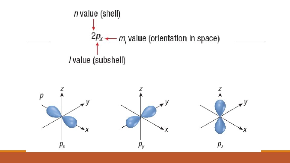 SHAPES AND ORIENTATION OF ORBTIALS Each orbital has a unique probability distribution, shape and orientation. ◦ S orbitals ◦ are spherical in shape and they become larger as the value of n increases. ◦ P orbitals – ◦ are not spherical like the s orbitals but have two lobes separated by a node at the nucleus. ◦ the p orbitals can exist in any of the three dimensions and are labeled using the xyz coordinate system along which the lobes lie. ◦ Ex. 2 p orbital with its lobes centered along the x axis is the 2 px orbital.