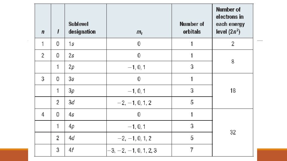 Example Problem List all the possible orbital numbers for the value of n = 5 l ml ms 0 1 2 3 4 0 -1, 0, +1 -2, -1, 0, +1, +2 -3, -2, -1, 0, +1, +2, +3 -4, -3, -2, -1, 0, +1, +2, +3, +4 -1/2, +1/2 -1/2, +1/2