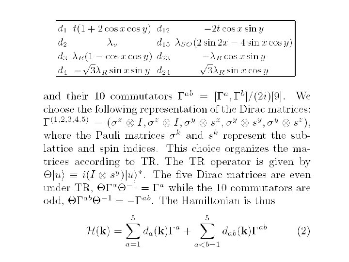 Kane-Mele Model of quantum spin Hall system Lattice structure and/or inversion symmetry breaking Graphene, Hg. Te at interface, Bi surface (Bernevig-S. C. Zhang) (Murakami) Pfaffian time-reversal operation Stability of edge modes Z 2 topological number = # of helical edge mode pairs Kane-Mele 2005