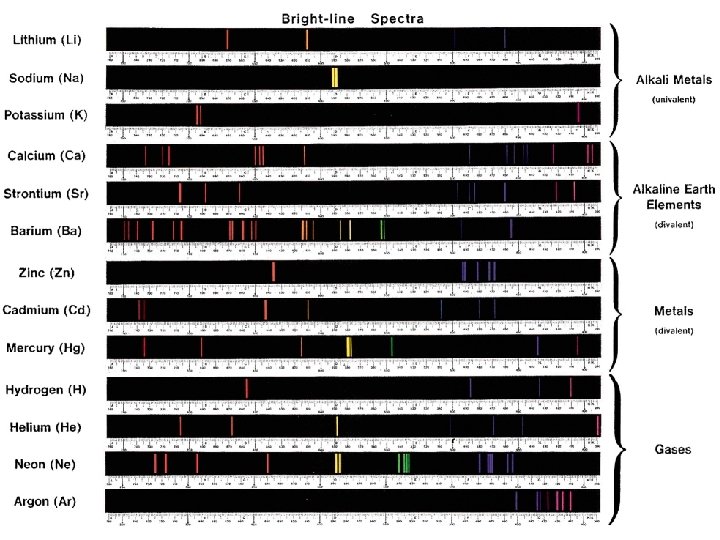 The Bohr Theory of the Hydrogen Atom • Atomic Line Spectra When a heated metal filament emits light, we can use a prism to spread out the light to give a continuous spectrum-that is, a spectrum containing light of all wavelengths. The light emitted by a heated gas, such as hydrogen, results in a line spectrum-a spectrum showing only specific wavelengths of light.