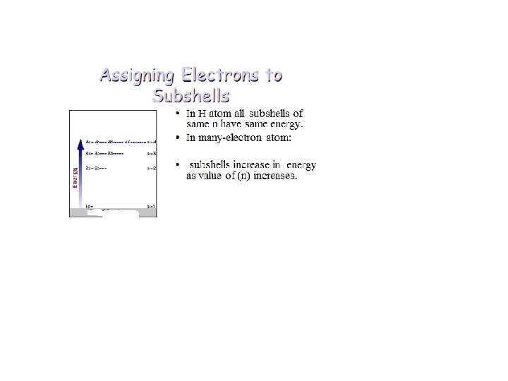 Assigning Electrons to Atoms • Electrons generally assigned to orbitals of successively higher energy. • For H atoms, E = - C(1/n 2). E depends only on n. • For many-electron atoms, energy depends on both n and l.